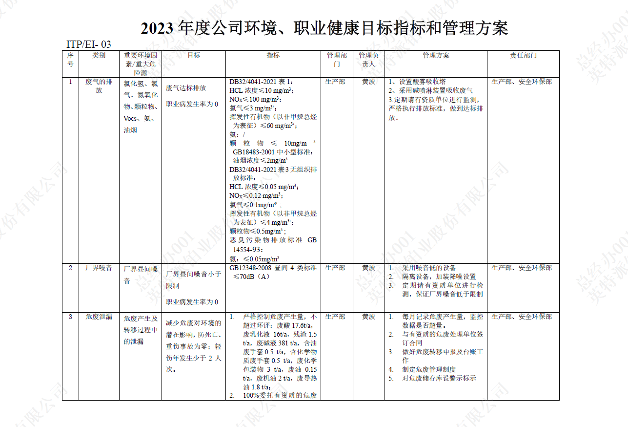 2023年度公司環境、職業健康目標指標和管理方案